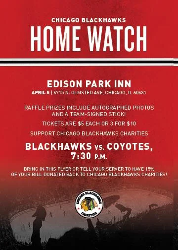 April 5th! Blackhawks Home Watch at EPI! Cheer on the Blackhawks and support Blackhawks Charities! 15% off all sales and 100% of all raffles! Chance to win a Signed Team Stick, Autographed Photos & Jersey!